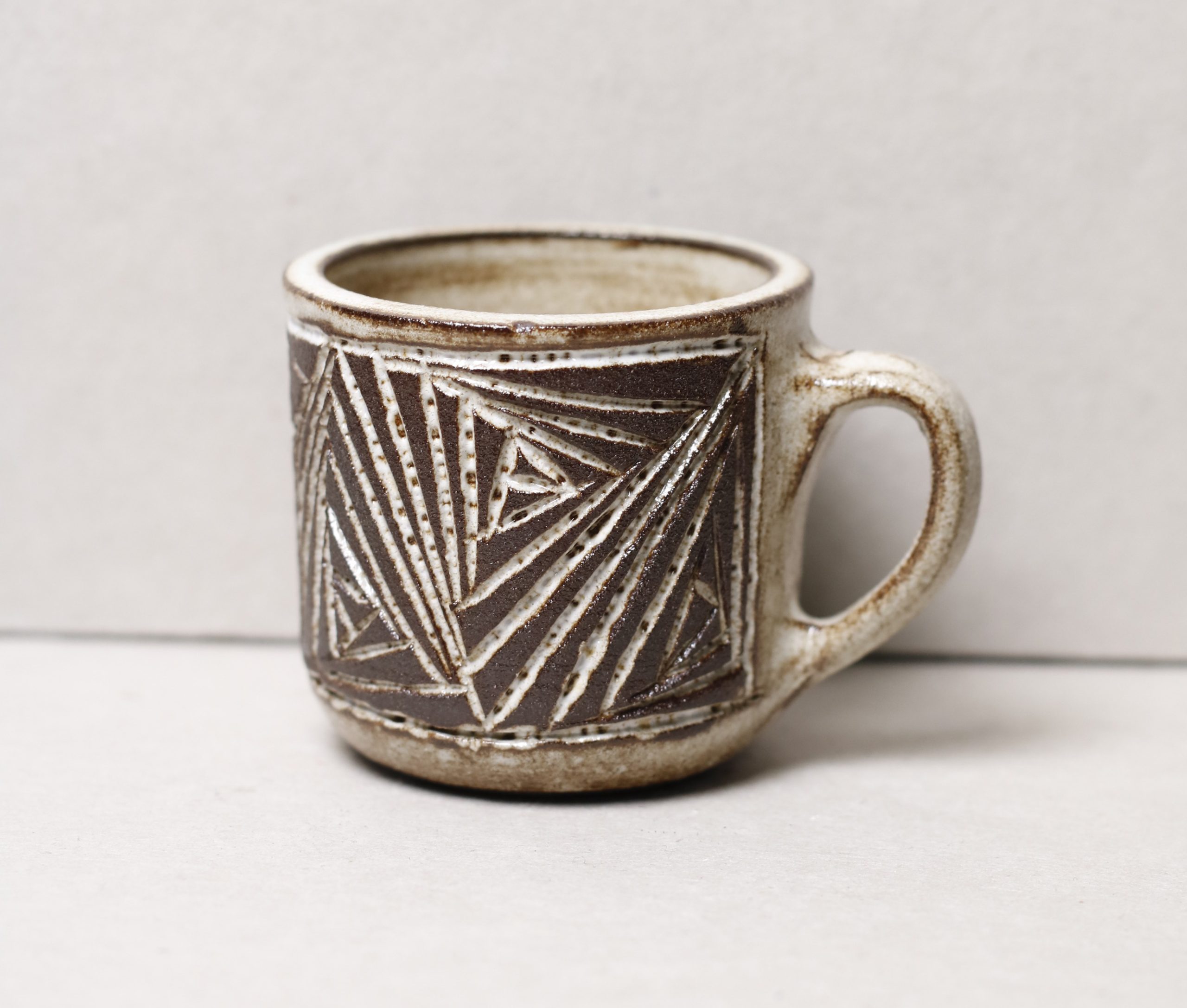 Ručně vyráběný dekorovaný hrneček na espresso z tmavé hlíny. Geometrický vzor. 50ml