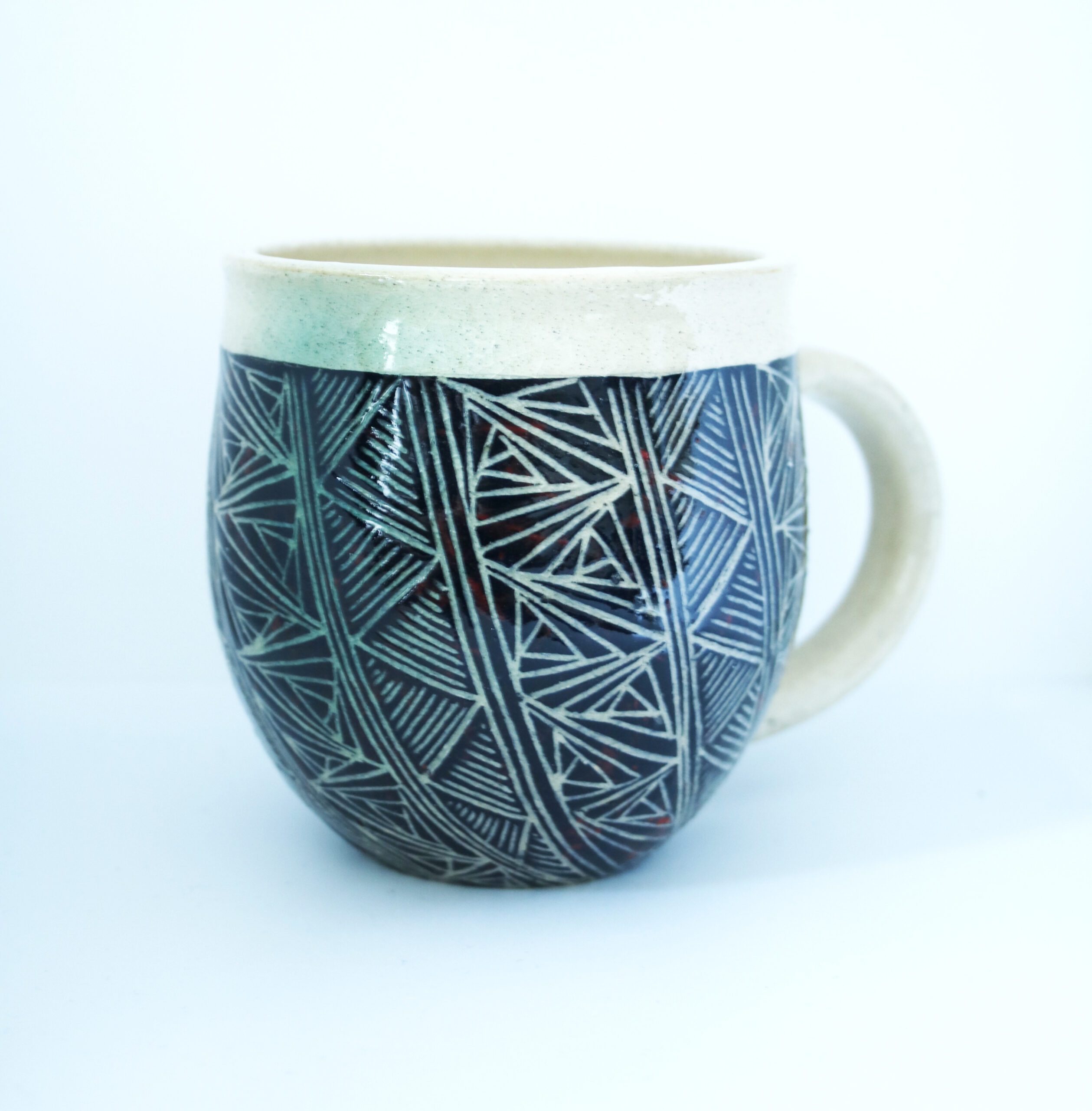Hrnek. Ručně vyřezávaný geometrický vzor. Barva černá/krémová
