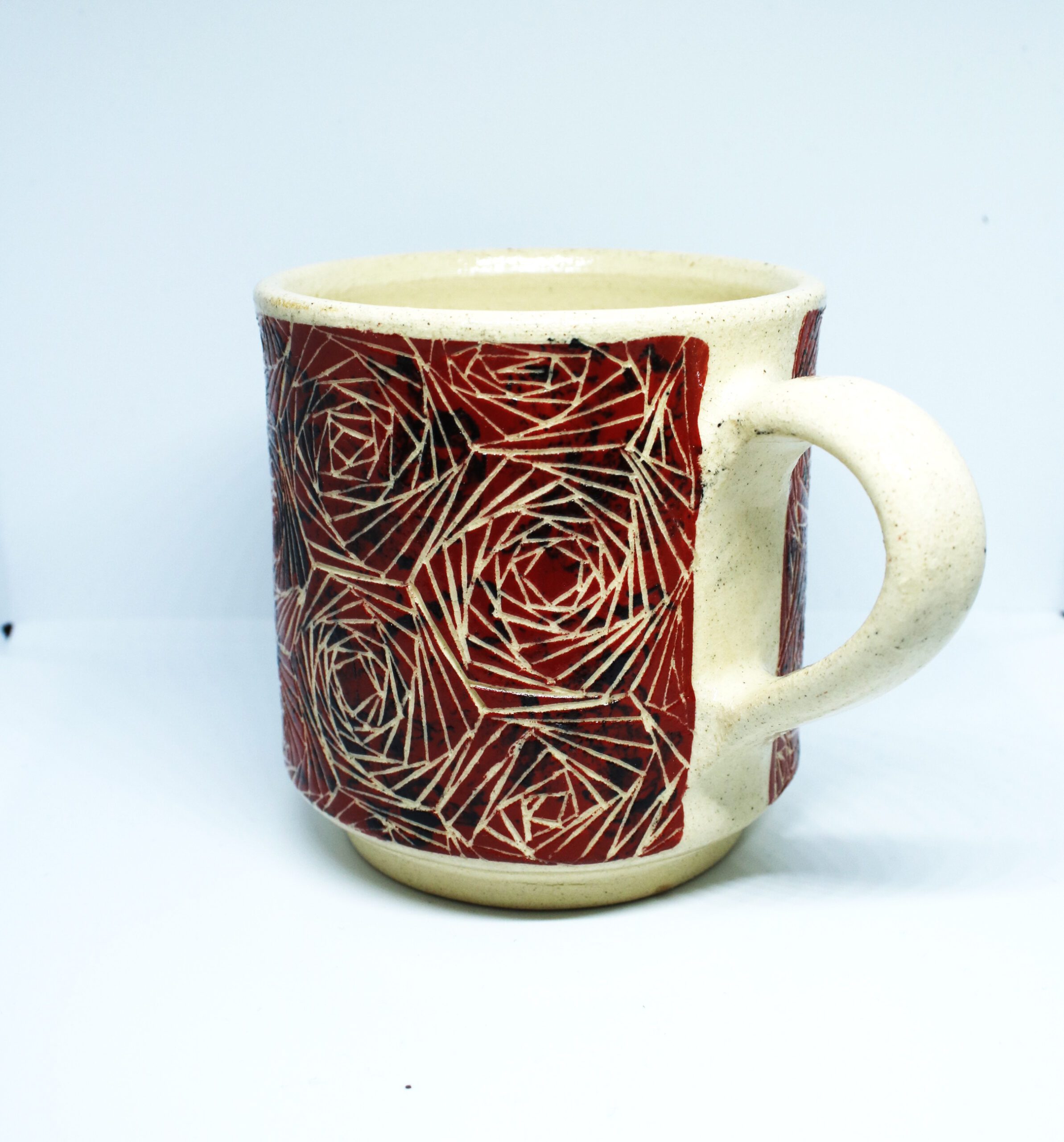 Hrnek. Ručně vyřezávaný geometrický vzor. Barva červená/krémová/černá