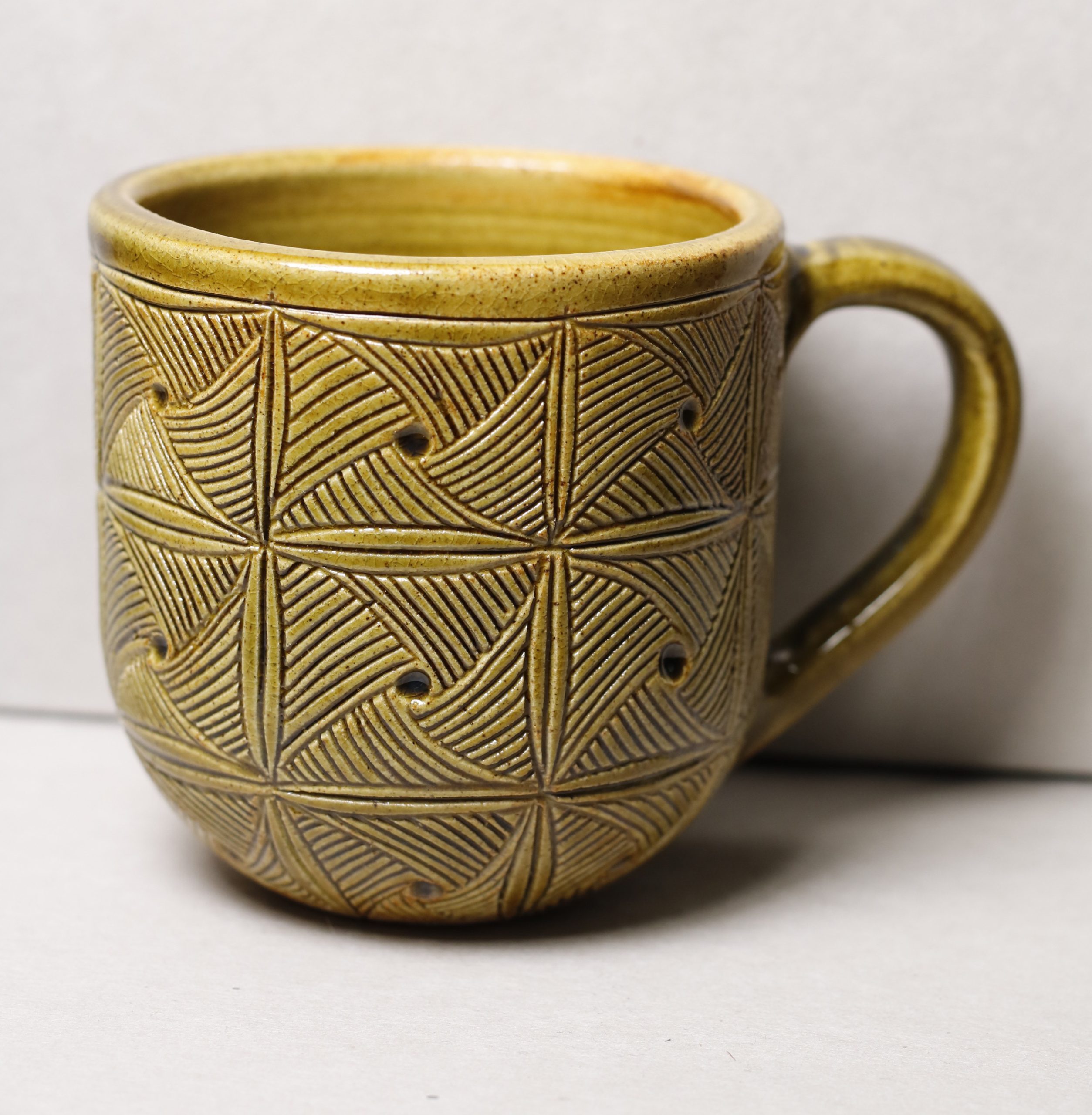 Ručně vyráběný keramický hrnek. Vyřezávaný geometrický vzor po celé ploše. 200ml