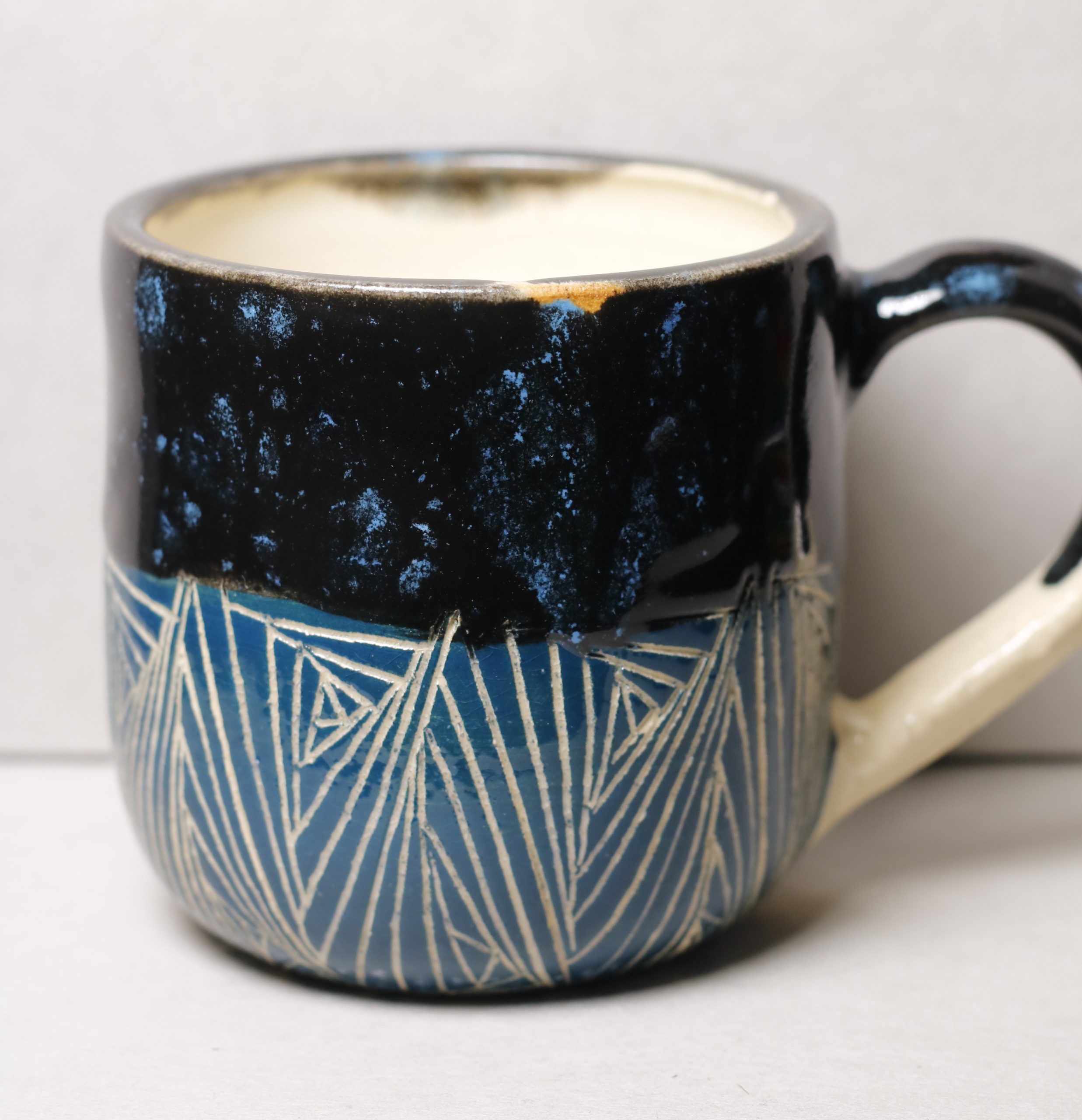 Ručně vyráběný keramický hrneček s vyřezávaným geometrickým vzorem v dolní části. 250ml