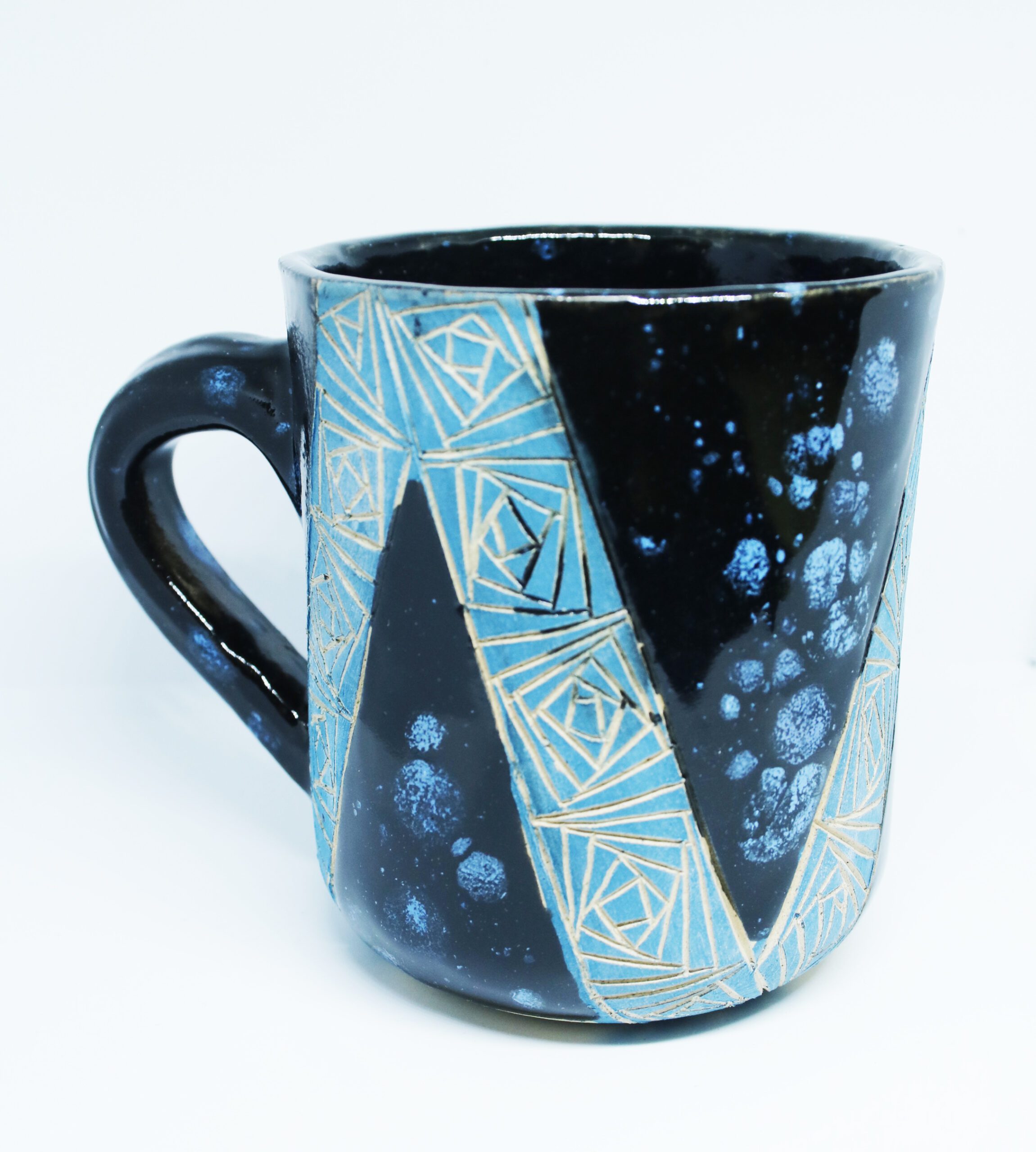 Hrnek. Ručně vyřezávaný geometrický vzor. Barva černá/modrá.
