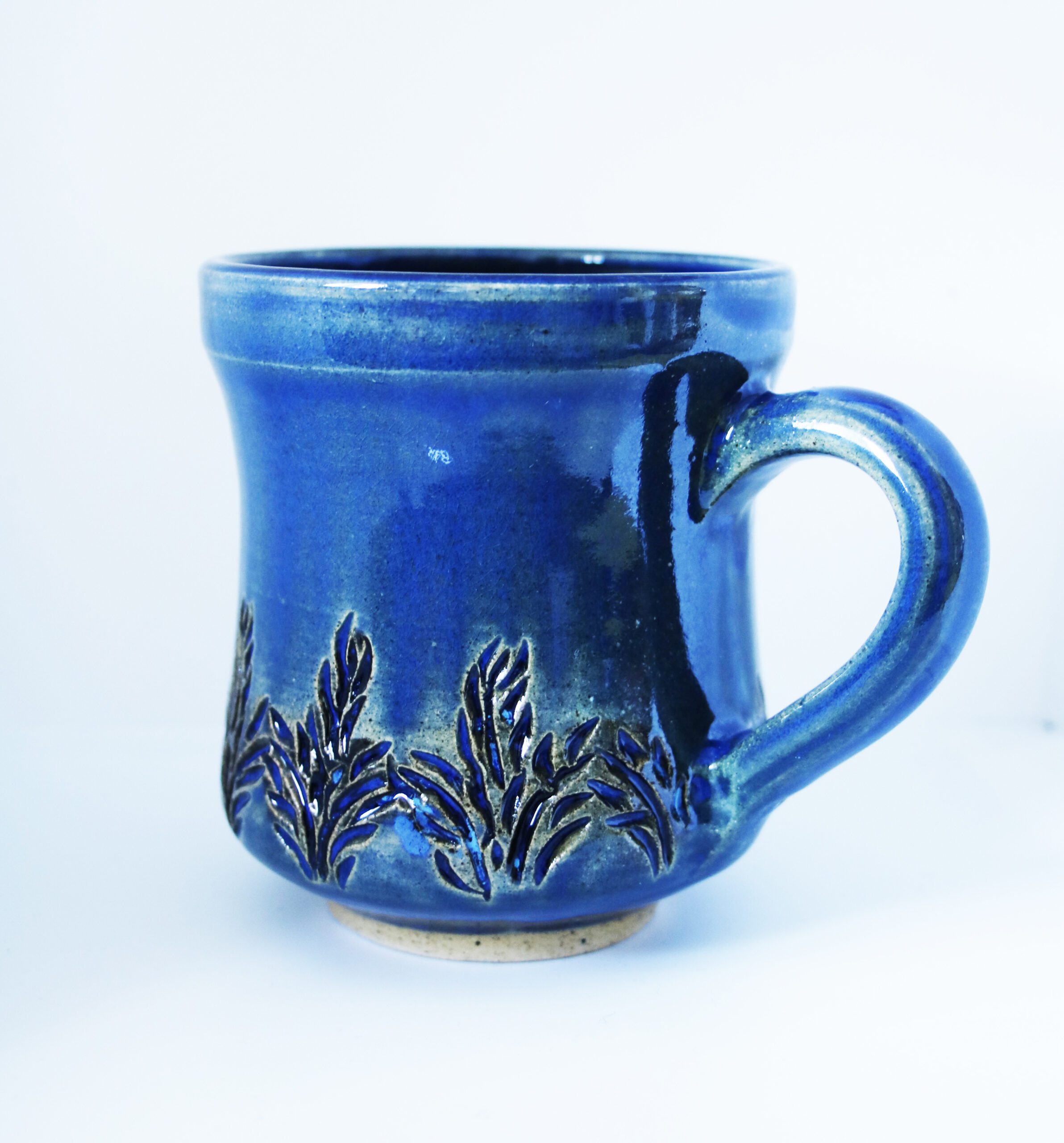 Hrnek. Ručně vyřezávaný květinový vzor. Barva tmavě modrá.