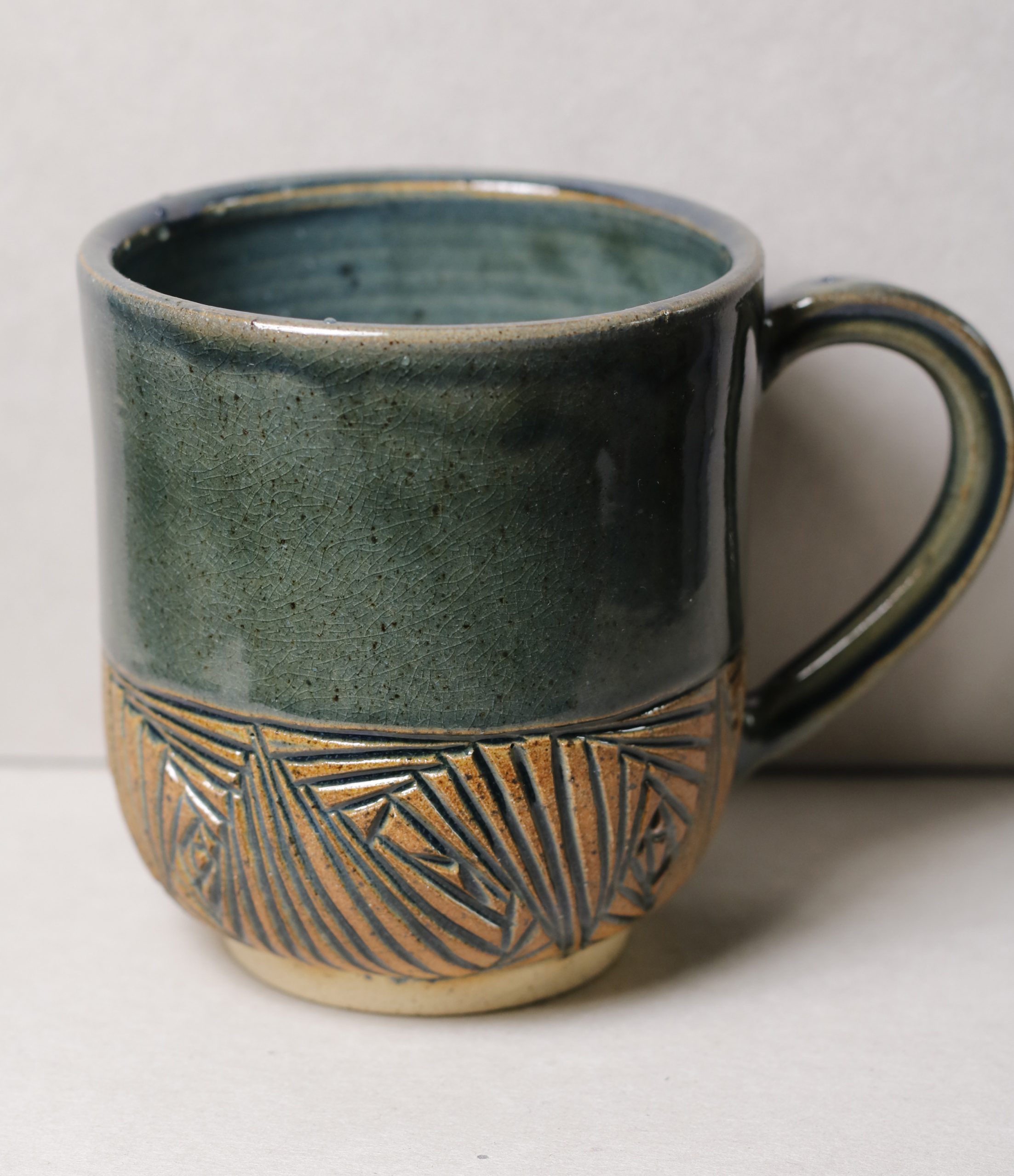 Ručně vyráběný keramický hrneček. Vyřezávaný geometrický vzor ve spodní části. 300ml