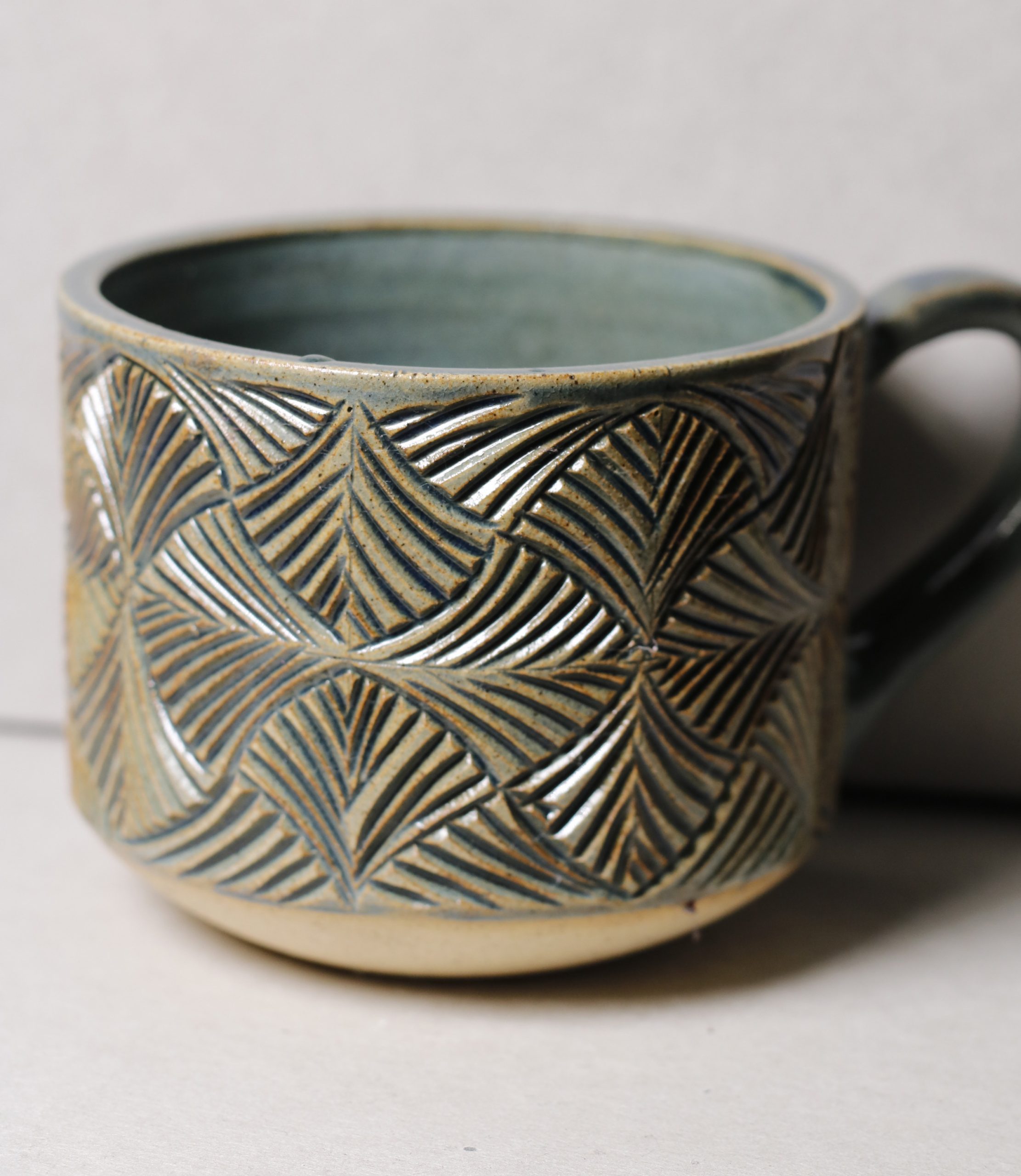 Ručně vyráběný keramický hrnek. Vyřezávaný geometrický vzor po celé ploše. 350ml