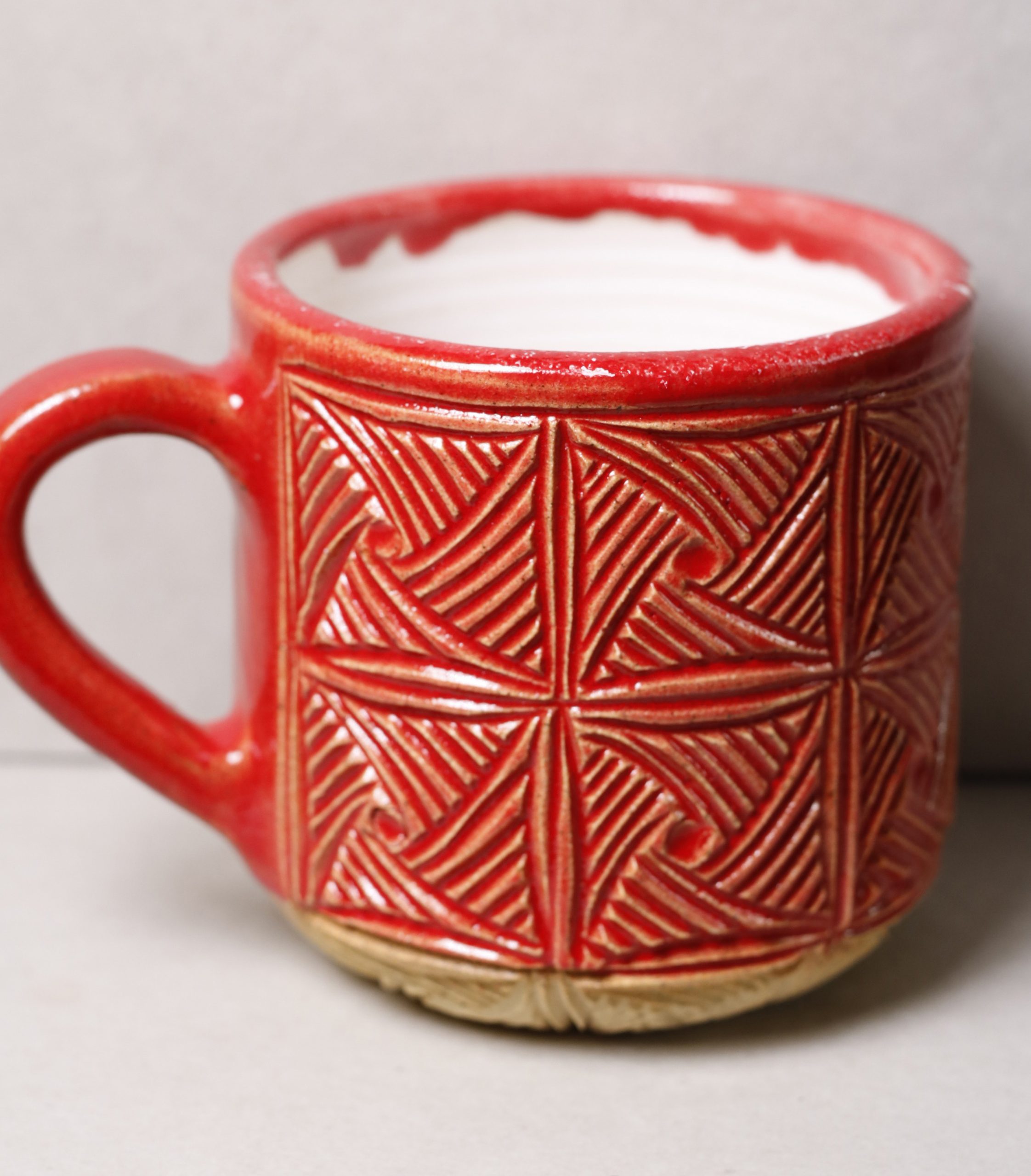 Ručně vyráběný keramický hrneček. Vyřezávaný geometrický vzor po celé ploše. 350ml