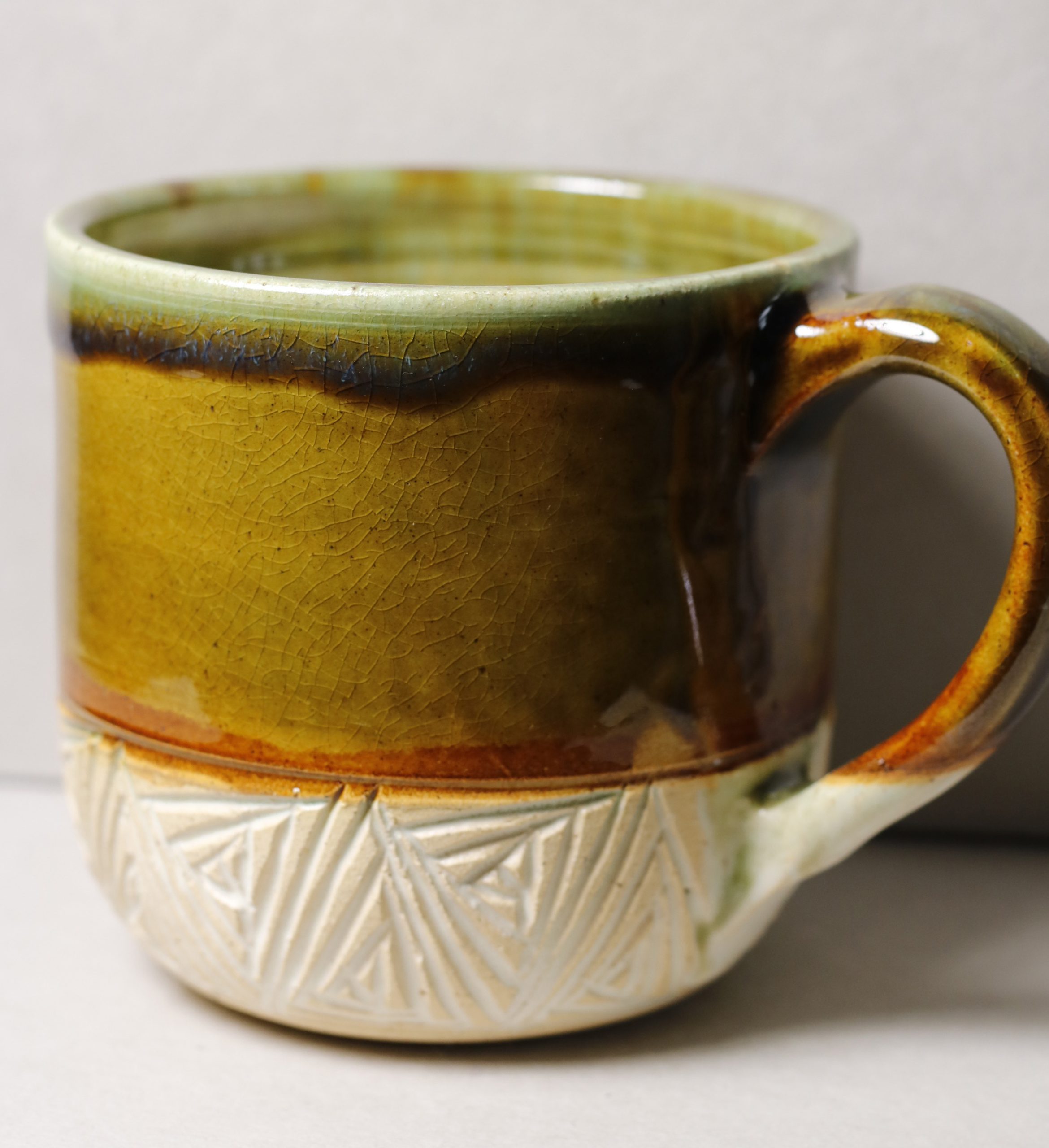 Ručně vyráběný keramický hrnek. Vyřezávaný geometrický vzor ve spodní části. 400ml