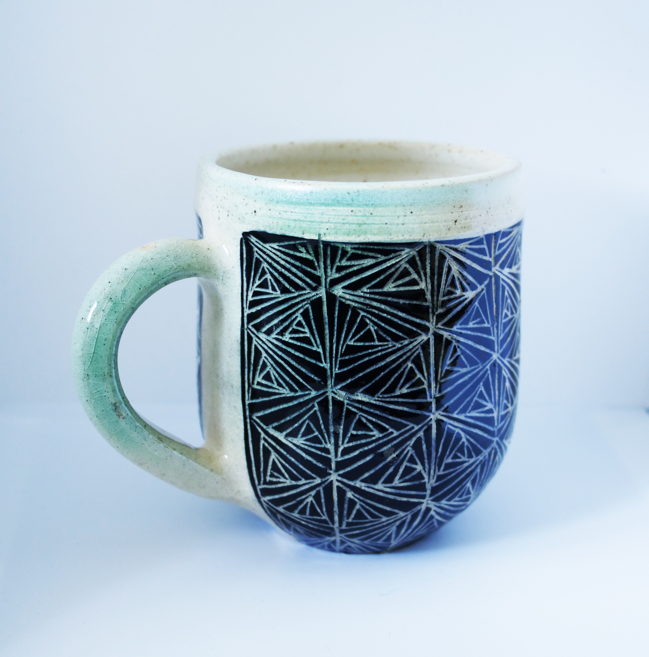 Hrnek. Ručně vyřezávaný geometrický vzor. Barva černá/bílá