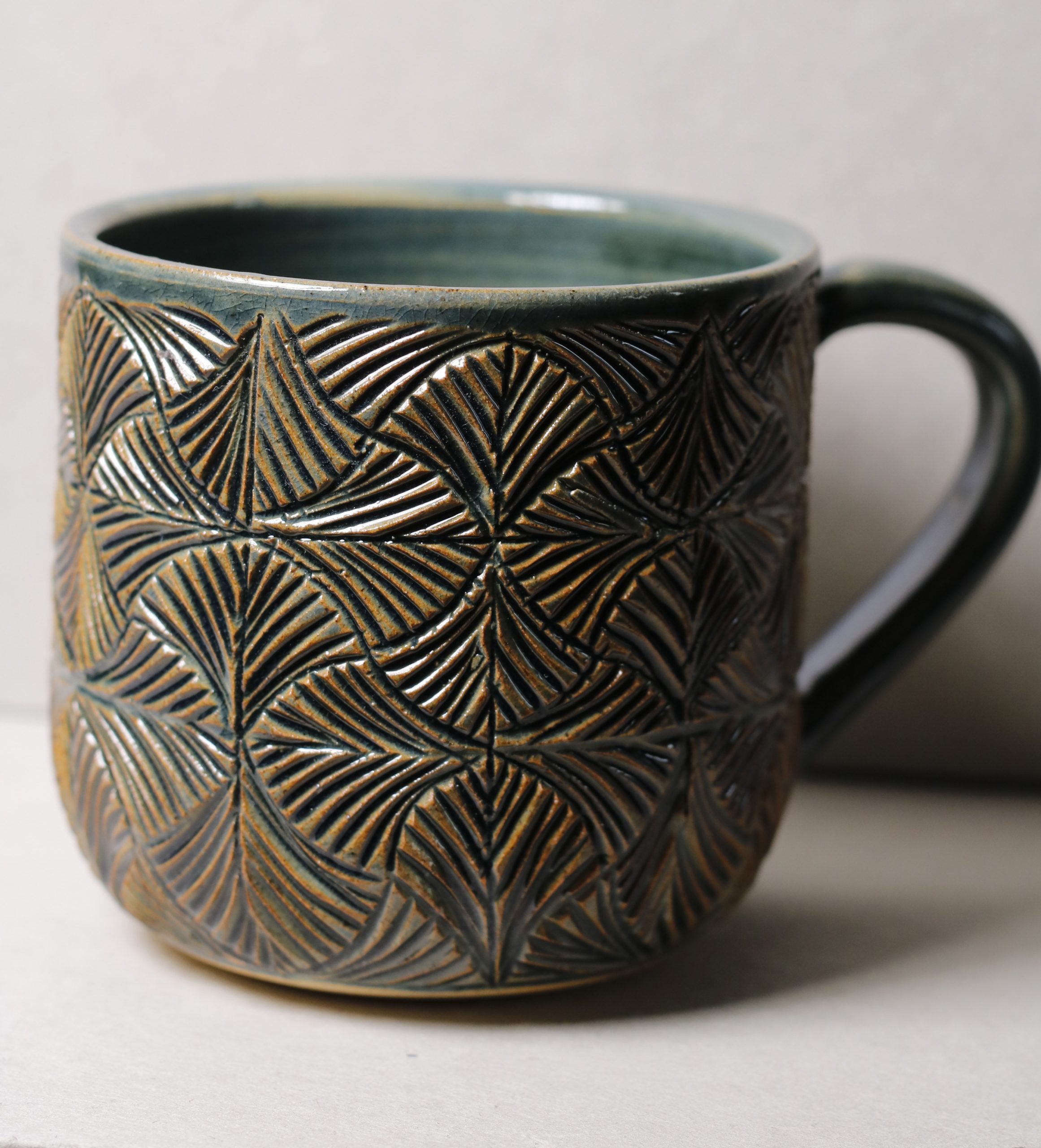 Ručně vyráběný keramický hrnek. Vyřezávaný geometrický vzor po celé ploše. 400ml