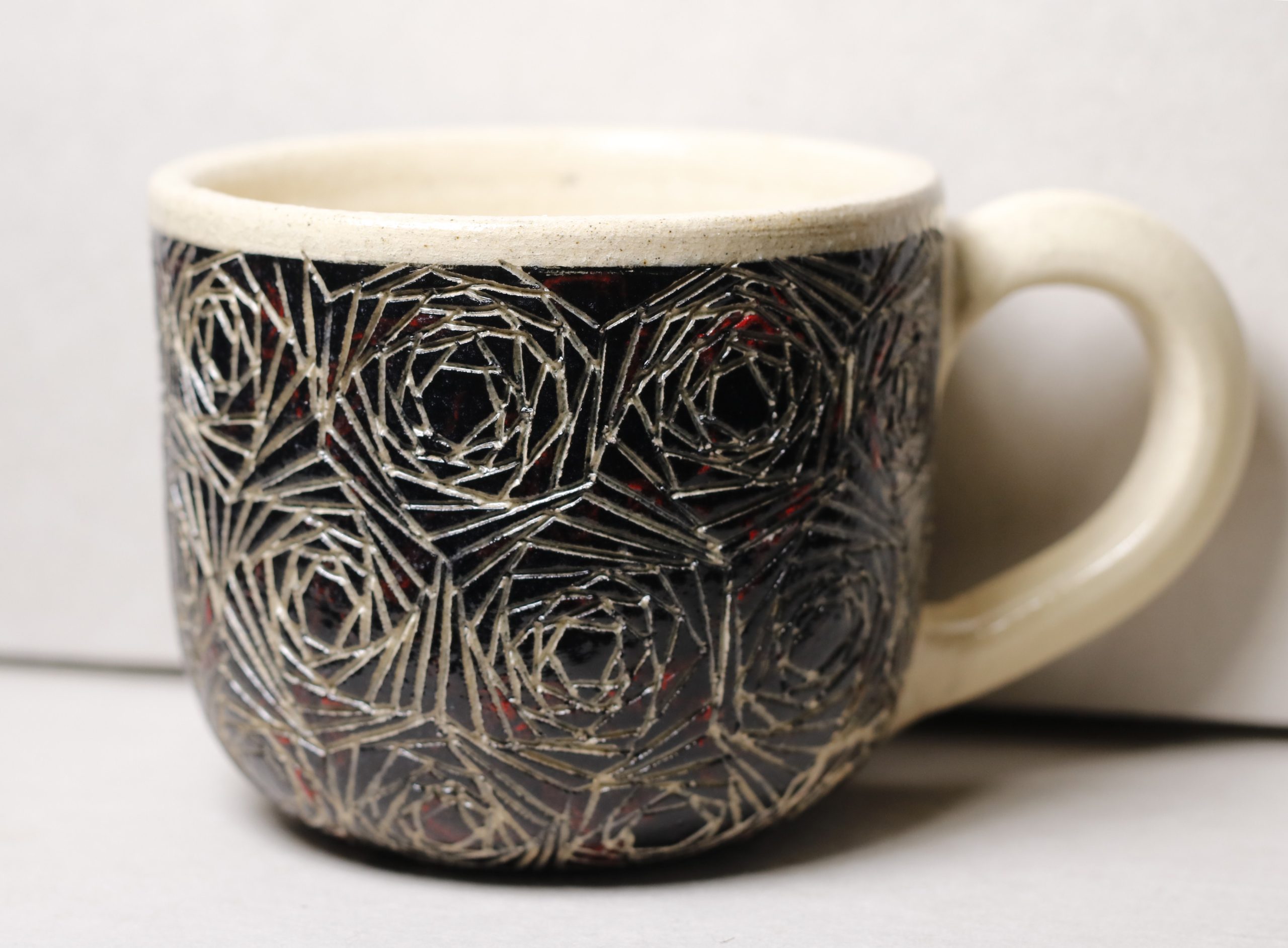 Ručně vyráběný keramický hrnek. Vyřezávaný geometrický vzor po celé ploše. 400ml