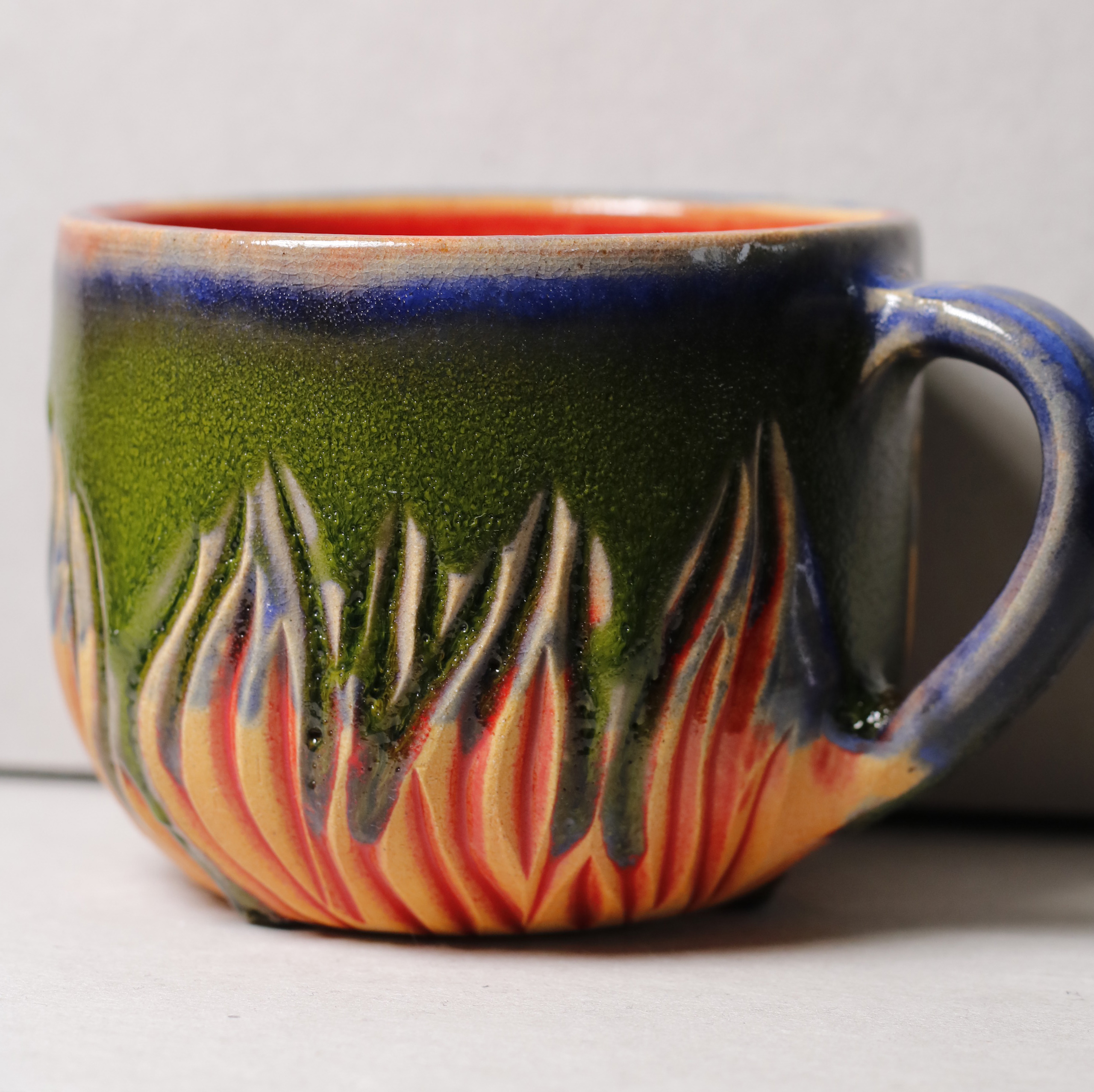 Ručně vyráběný keramický hrnek. Vyřezávaný vzor plamene. 400ml