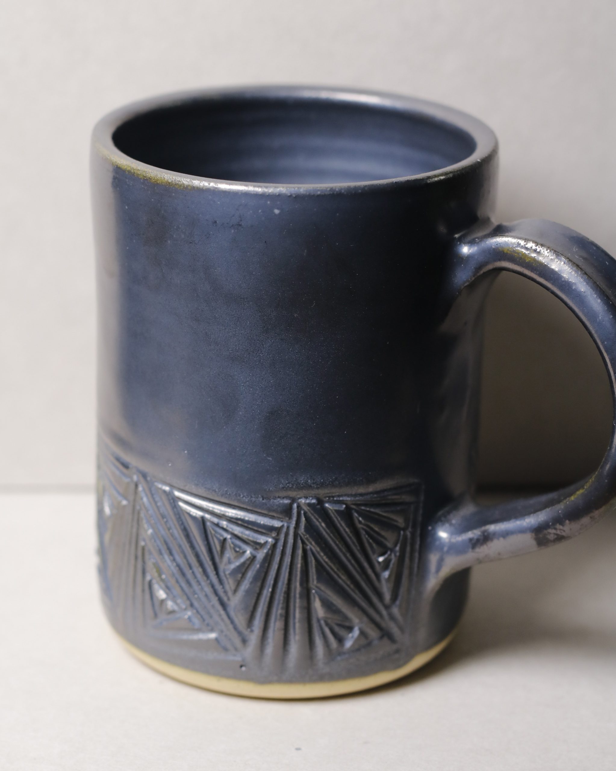 Ručně vyráběný keramický hrnek. Vyřezávaný geometrický vzor ve spodní části. 400ml