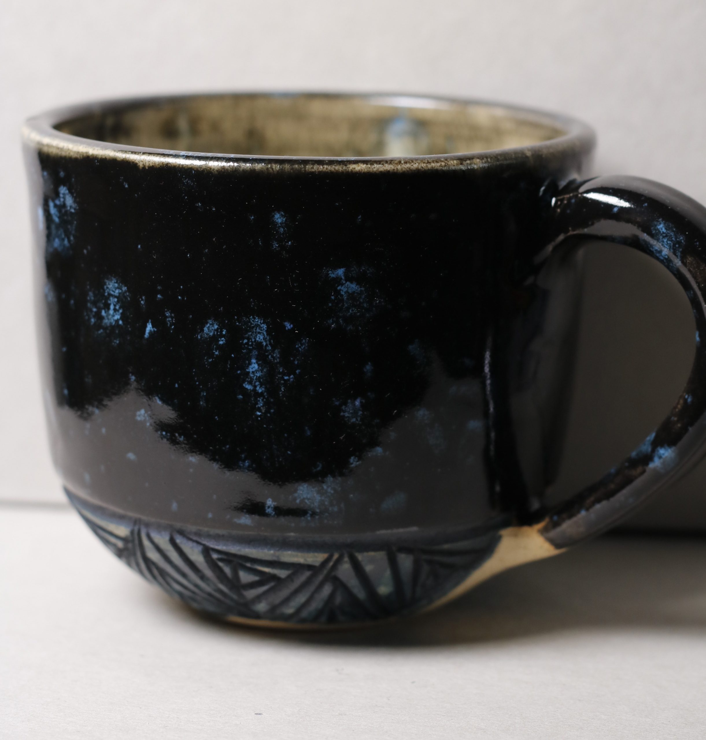 Ručně vyráběný keramický hrnek. Vyřezávaný geometrický vzor ve spodní části. 450ml – 500ml