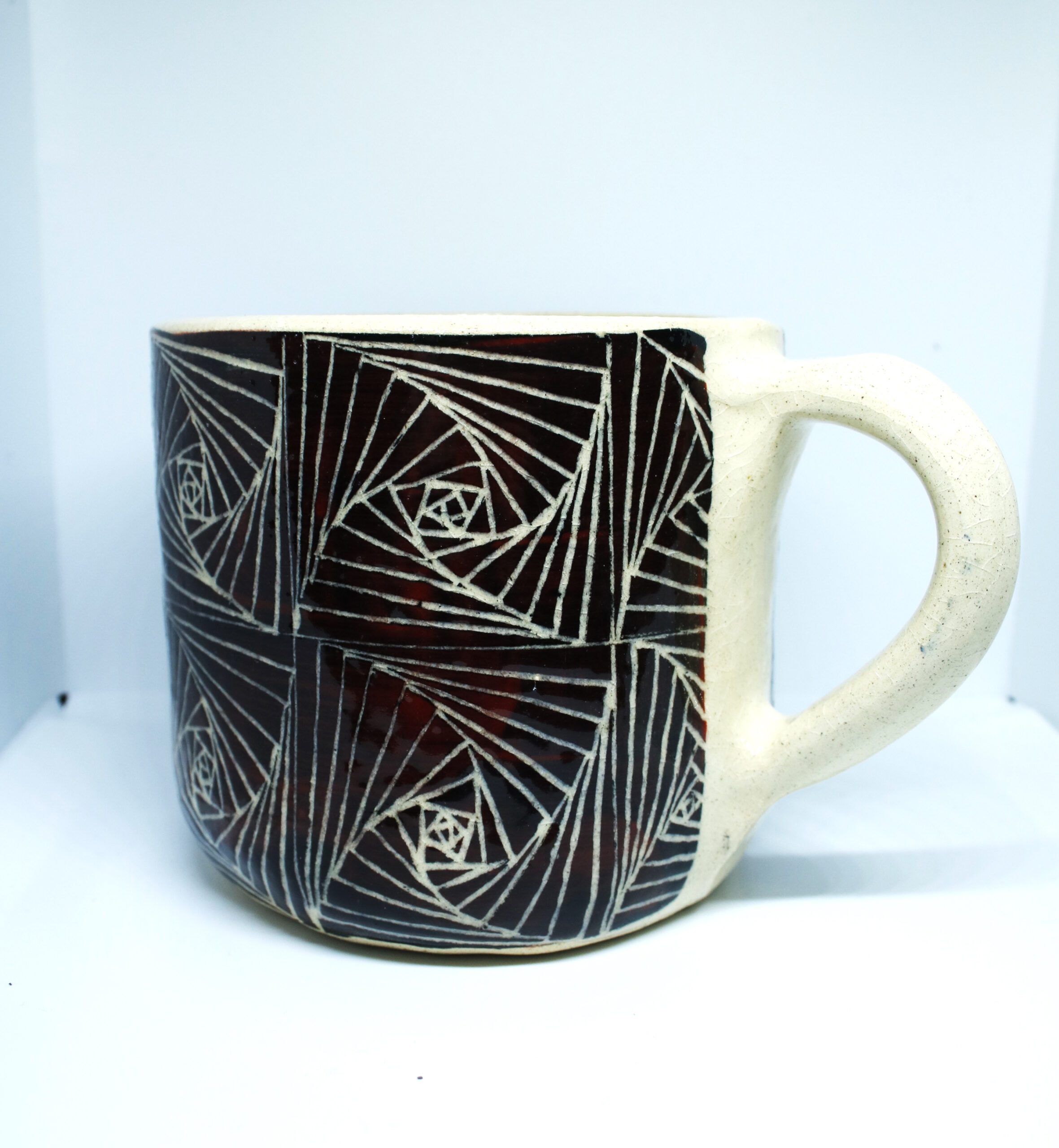 Hrnek. Ručně vyřezávaný vzor. Barva tmavě červená.