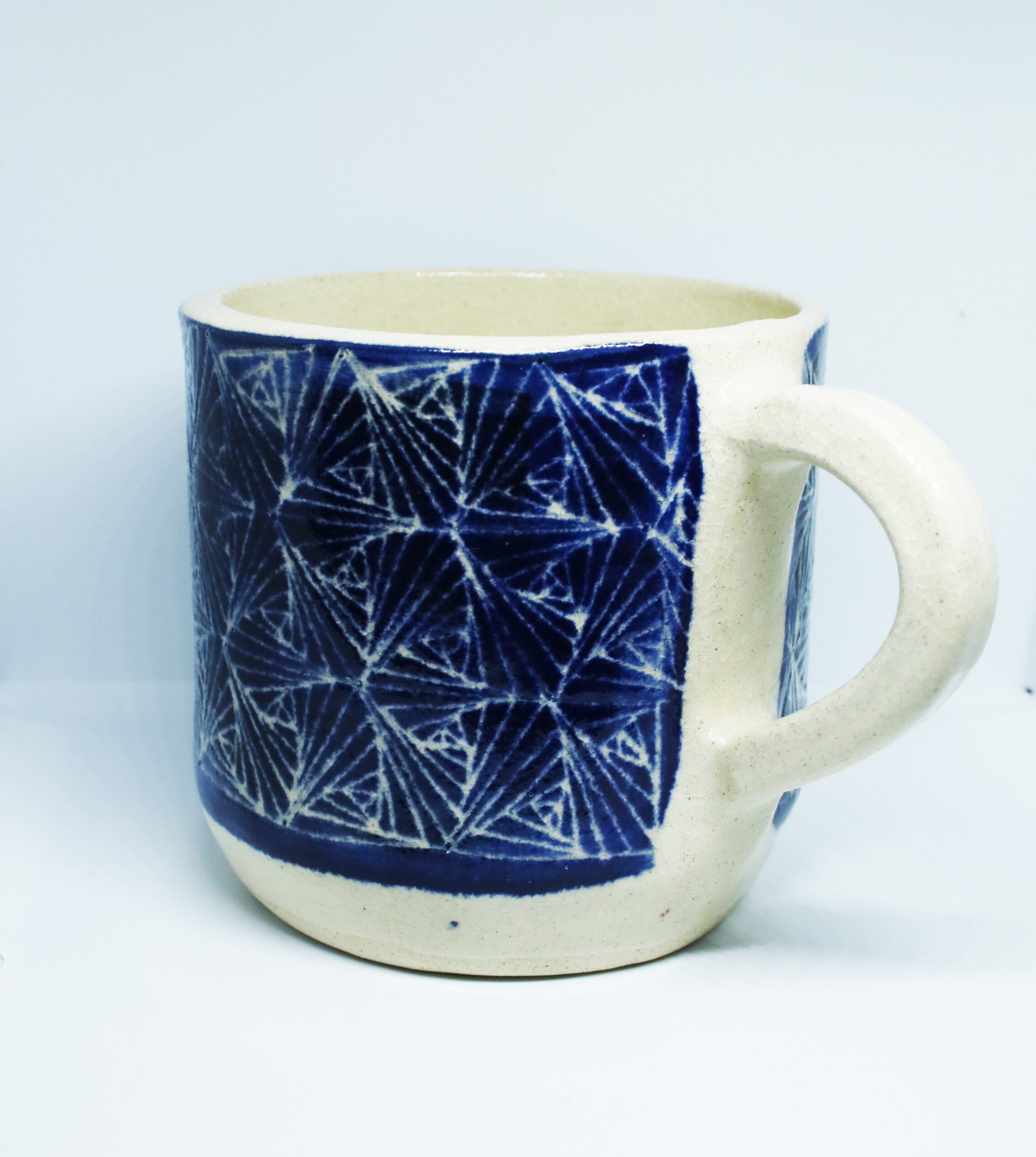 Hrnek. Ručně vyřezávaný geometrický vzor. Barva tmavě modrá
