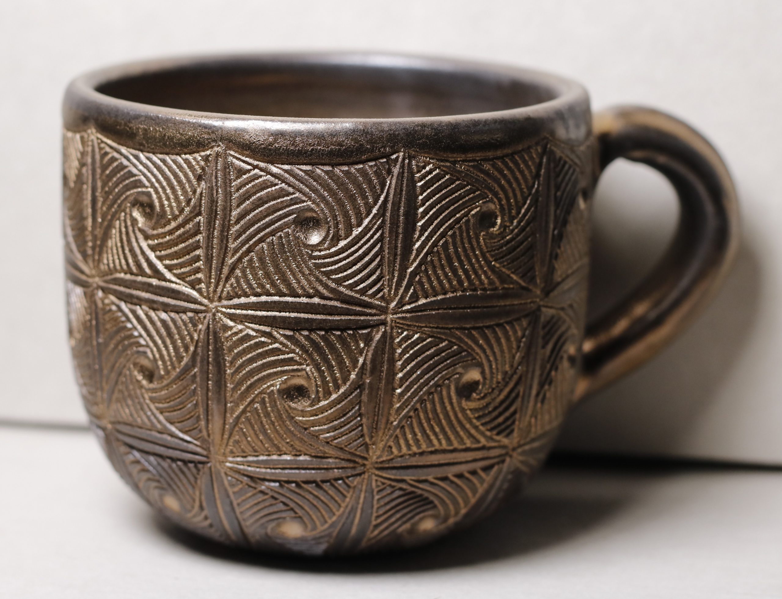 Ručně vyráběný keramický hrnek. Vyřezávaný geometrický vzor po celé ploše. 500ml