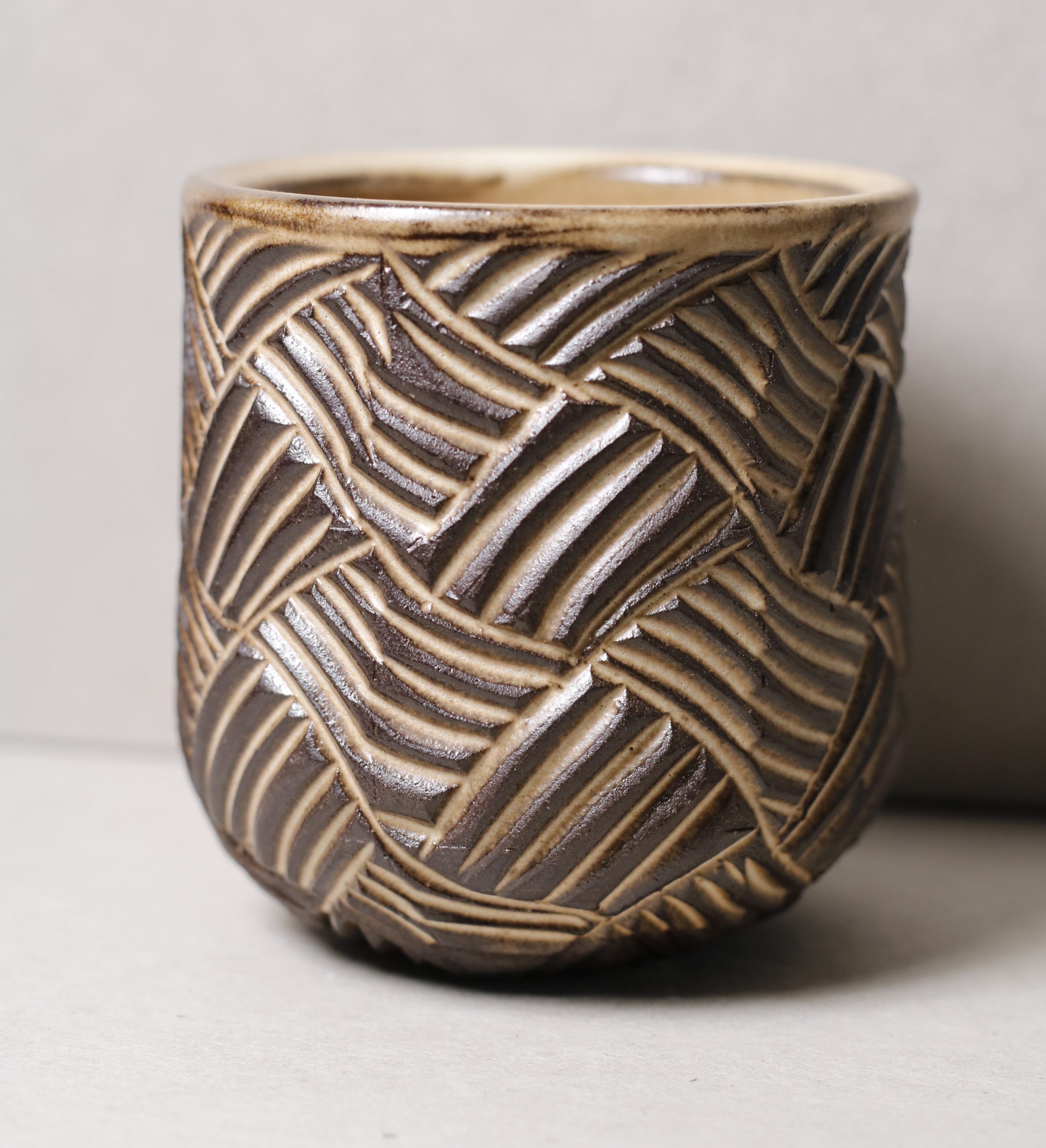 Ručně vyráběný keramický kalíšek z tmavé hlíny. Vyřezávaný geometrický vzor po celé ploše. 100ml