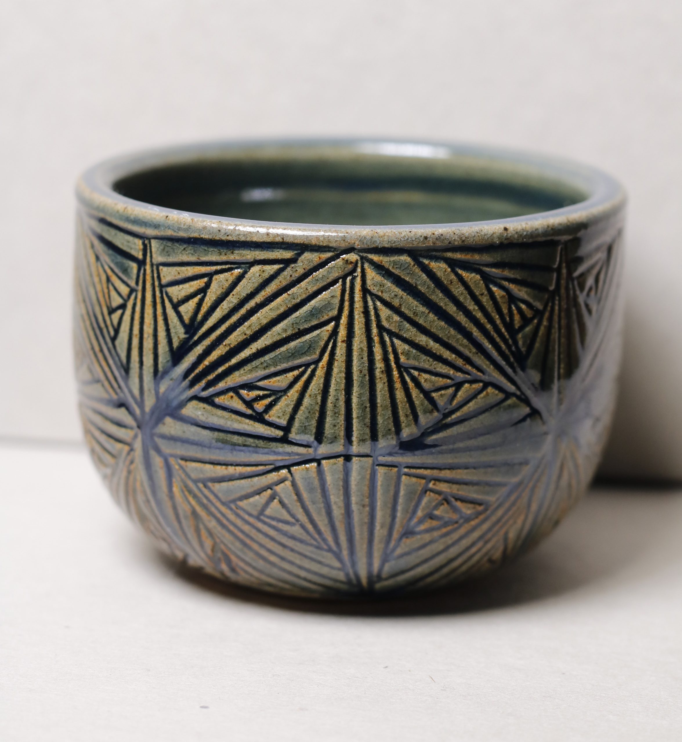 Ručně vyráběný keramický kalíšek. Vyřezávaný geometrický vzor po celé ploše. 150ml
