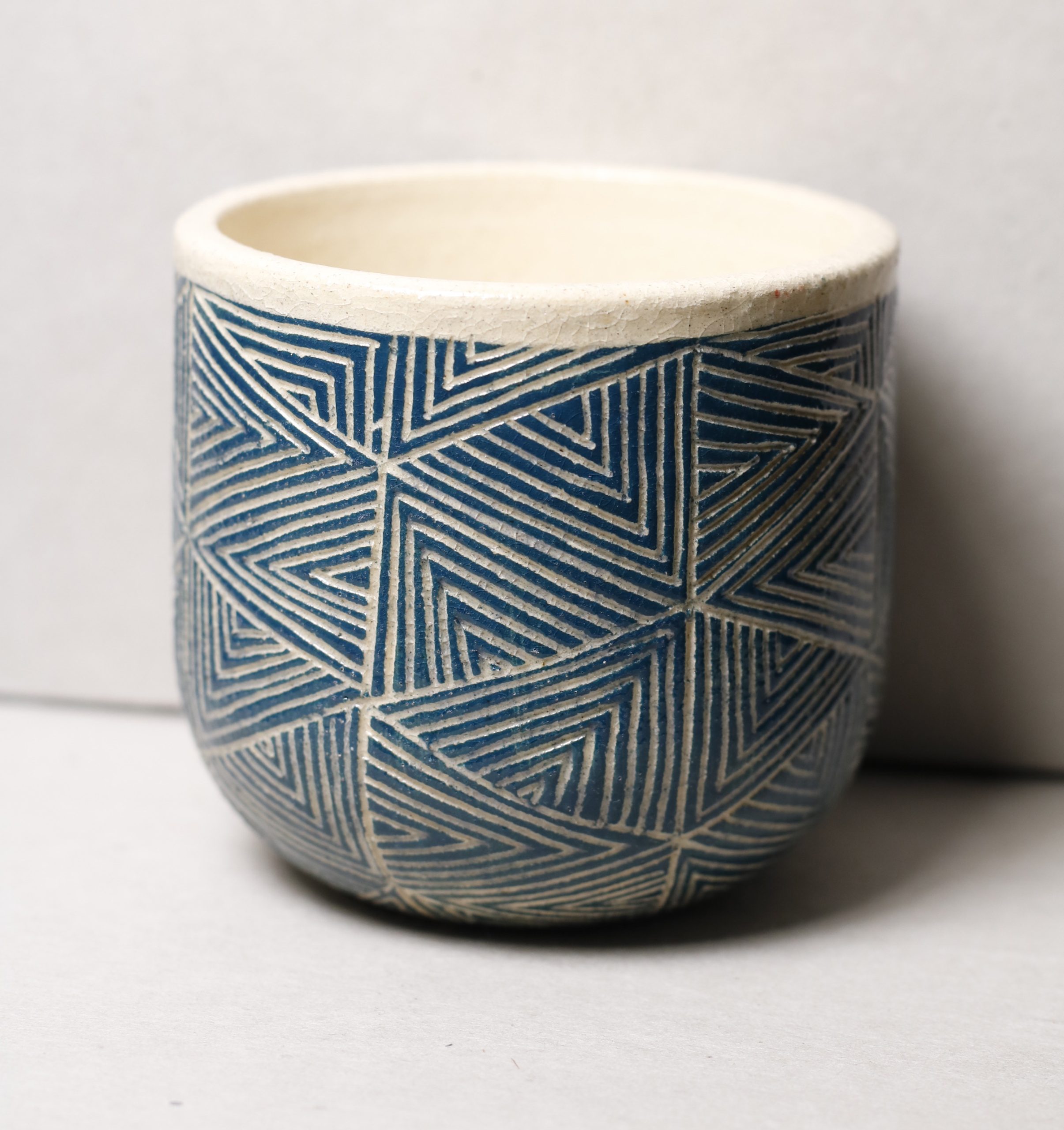 Ručně vyráběný keramický kalíšek. Vyřezávaný geometrický vzor po celé ploše. 200ml
