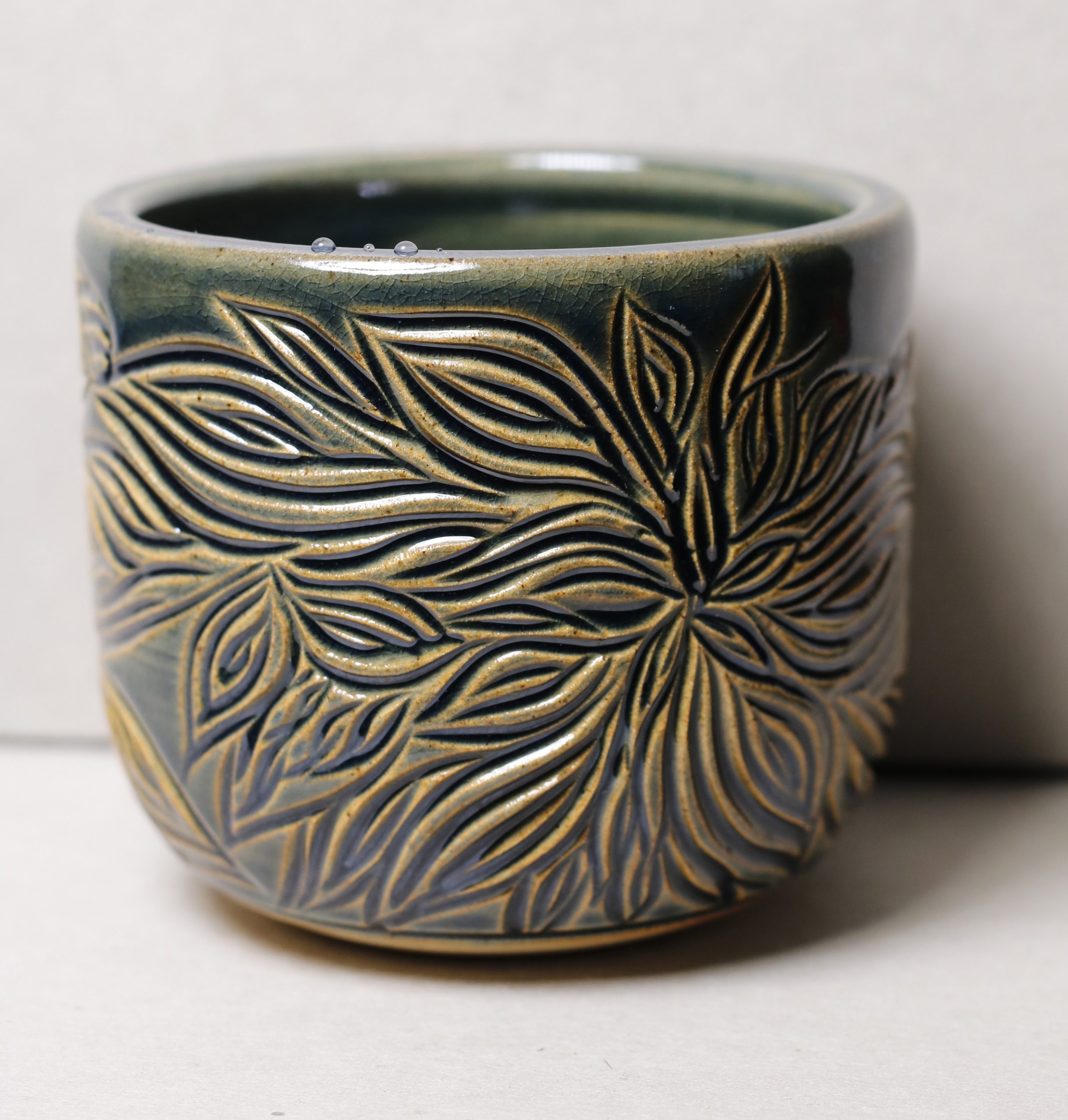 Ručně vyráběný keramický kalíšek. Vyřezávaný květinový vzor. 300ml