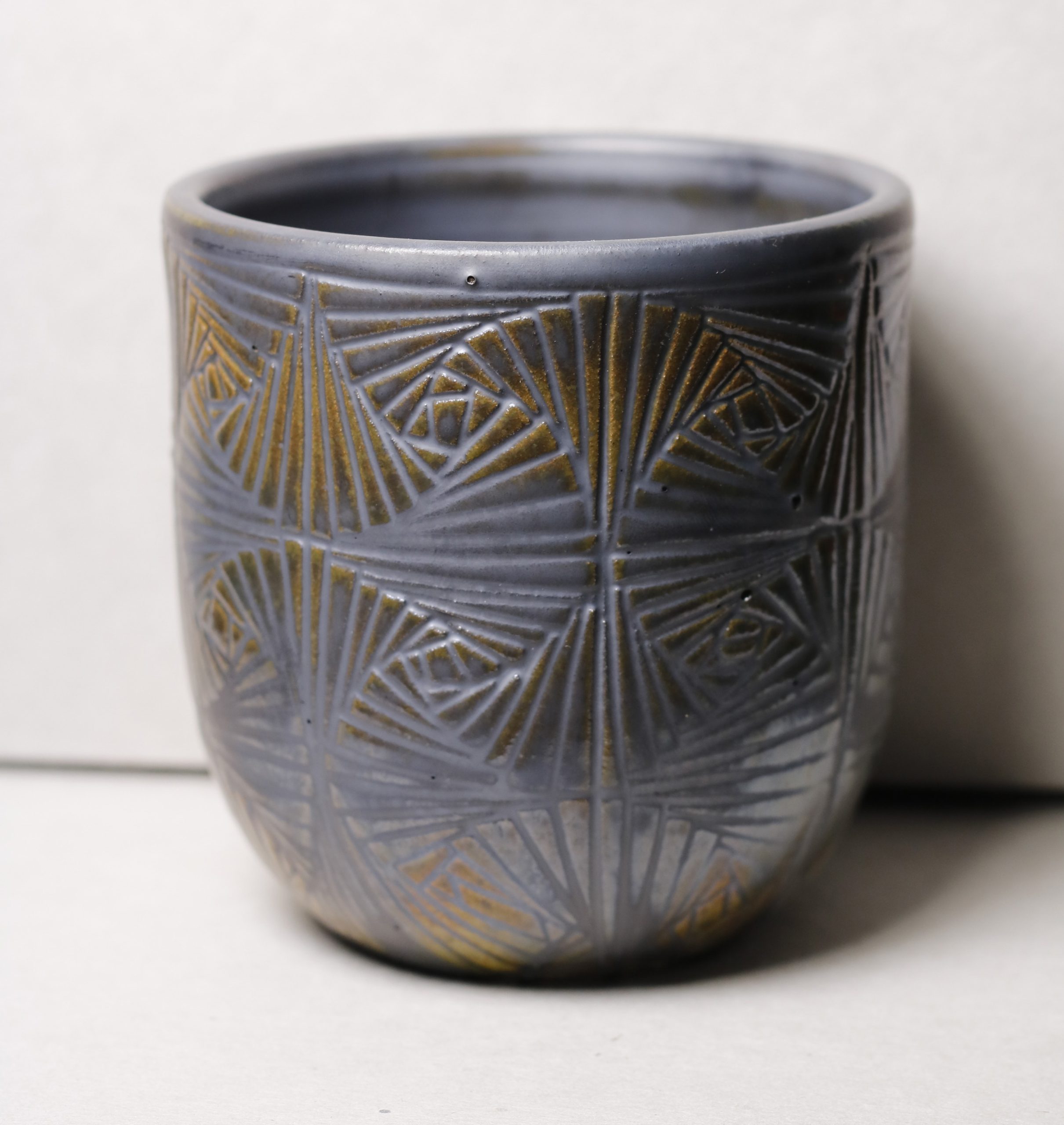 Ručně vyráběný keramický kalíšek. Vyřezávaný geometrický vzor po celé ploše. 450ml