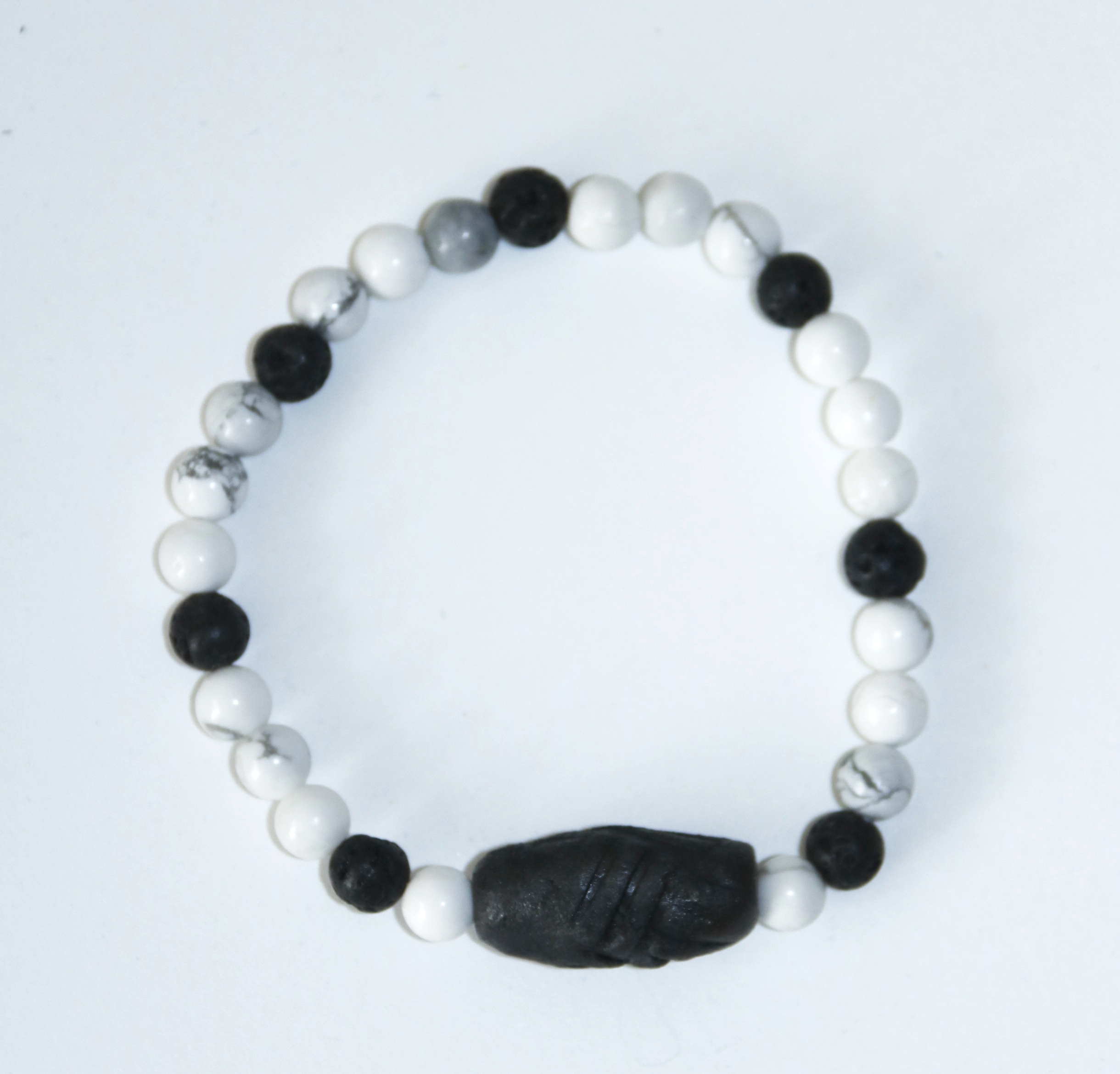 Náramek z minerálů a ručně vyráběného keramického korálku vypalovaného v ohni.