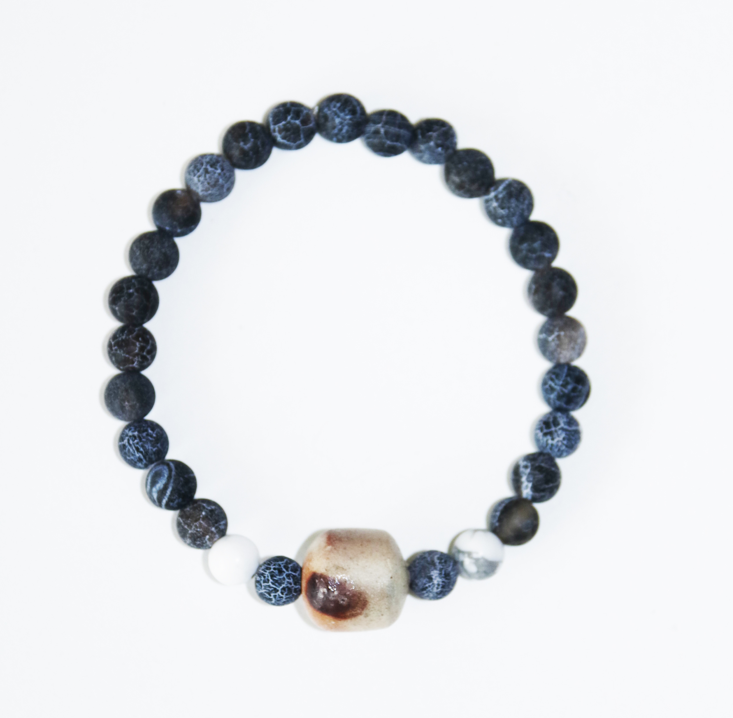 Náramek z minerálů a ručně vyráběného keramického korálku vypalovaného v ohni.