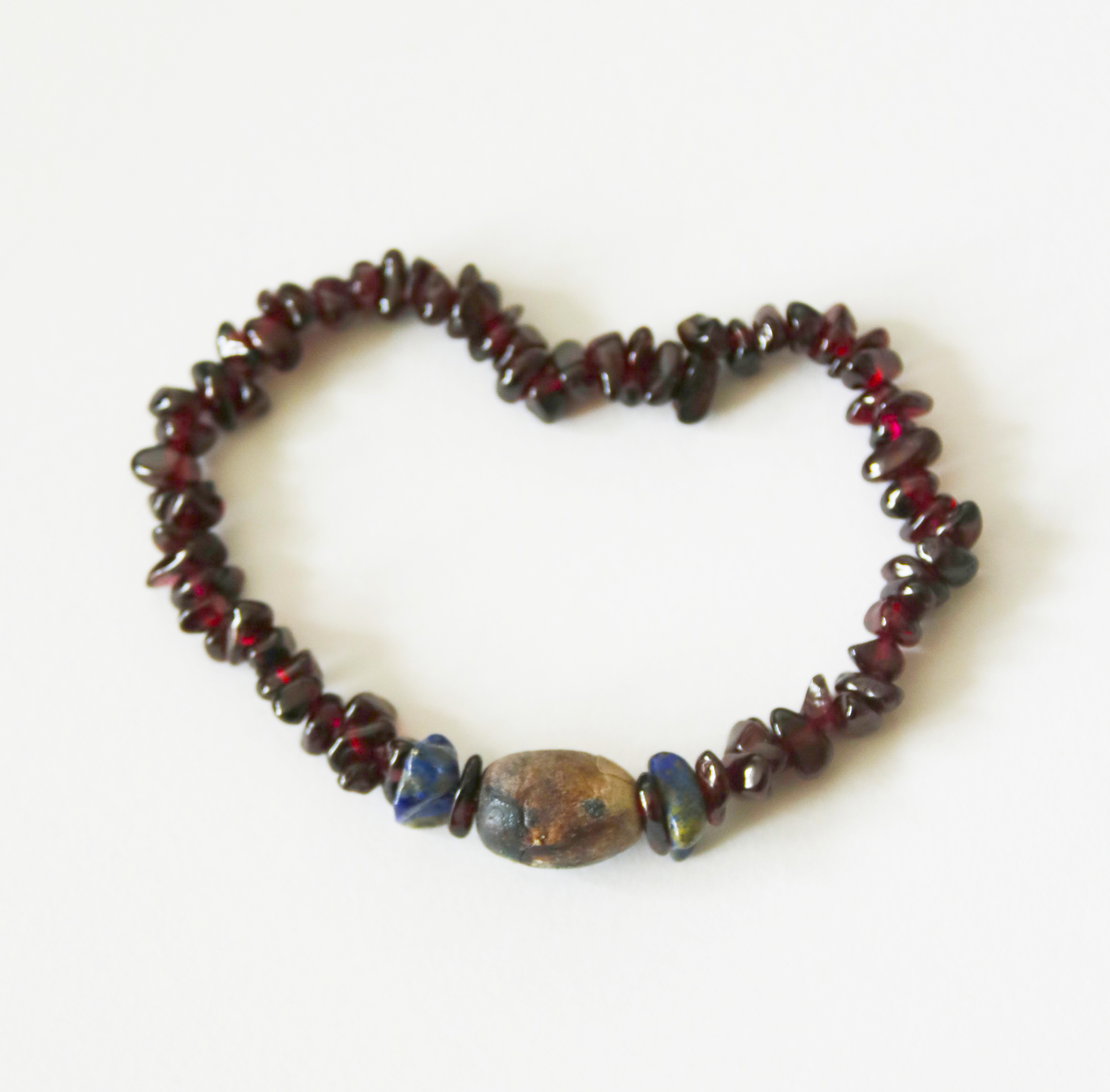 Náramek z minerálů a ručně vyráběného keramického korálku vypalovaného v ohni. Použité minerály: úlomky granátu a sodalitu